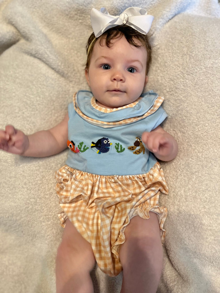 Bubble: Knit fabric with light stretch. Color: Light Baby Blue & Peach Orange Gingham. Sizing: Runs true to size ( Size charts are available ). Fabric: 95% cotton, 5% spandex